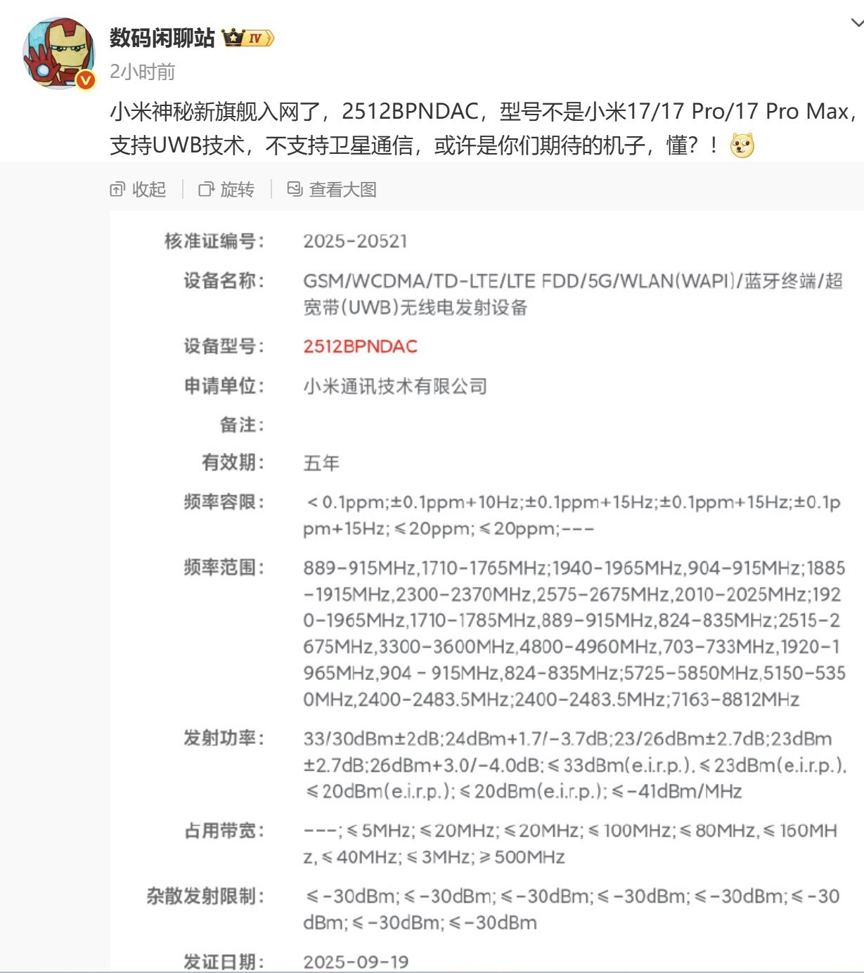 【CNMO科技消息】9月20日,知名数码博主数码闲聊站爆料,小米神秘新旗舰入网,设备型号是2512BPNDAC。该新品并不是小米17/17 Pro/17 Pro Max,支持UWB技术,不支持卫星通信,或许是你们期待的机子,懂?!
