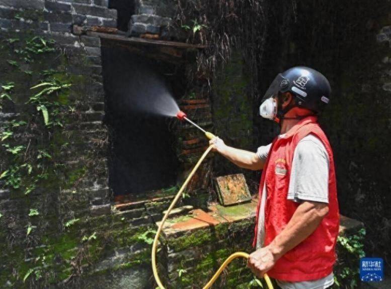 7月25日,工作人员在佛山市顺德区庄头村喷药消杀蚊虫。新华社图