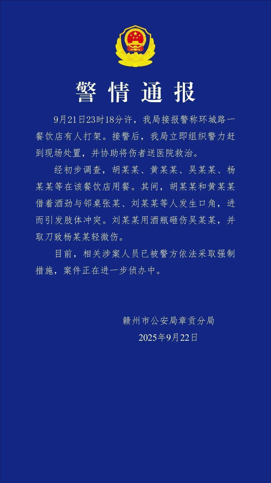 9月22日,赣州市公安局章贡分局发布警情通报:9月21日23时18分许,章贡分局接报警称环城路一餐饮店有人打架。接警后,章贡分局立即组织警力赶到现场处置,并协助将伤者送医院救治。